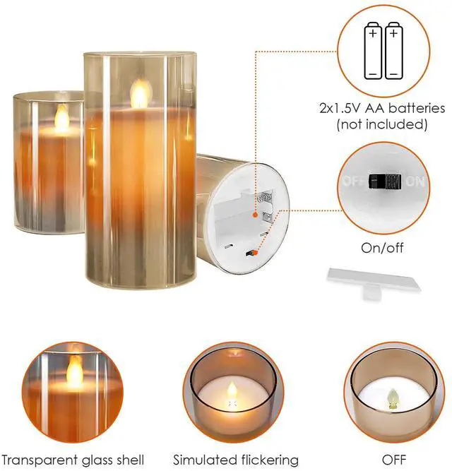 Battery Operated:Each candle requires 2x1.5V AA batteries(not included). No more worry about dripping wax,smoke,and potential fire danger. Your kids and pets can enjoy a safe and clean environment with these flameless candles.