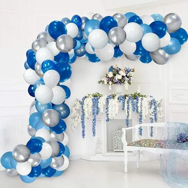Balloon Arch BlueBlue silver balloon garland are a hot party supplies trend. White and blue balloons can be filled with air or helium. However, white blue and silver balloons of royal blue balloon garland kit will not float up when pumped with air. Blue balloon arch holder kit with balloons will be sure to create your party or royal balloon garland arch decorations.
