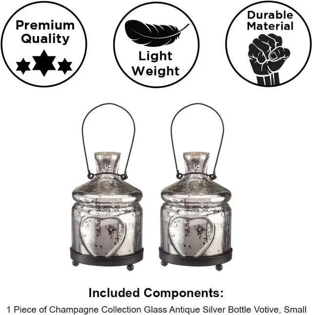 Create the perfect ambiance for your special events and home with our Antique Silver Bottle Votive Candle Holders. These handcrafted glass votives, finished with a speckled effect, are designed to add a personal touch of elegance and warmth to any setting. Whether you're planning a wedding, hosting a party, or simply looking to enhance your home decor, these versatile votives are the ideal choice. They can be used with LED tea lights for safety or with regular wax tea lights, and they offer the flexibility to be hung or placed as you prefer, allowing you to create the look and feel you desire.