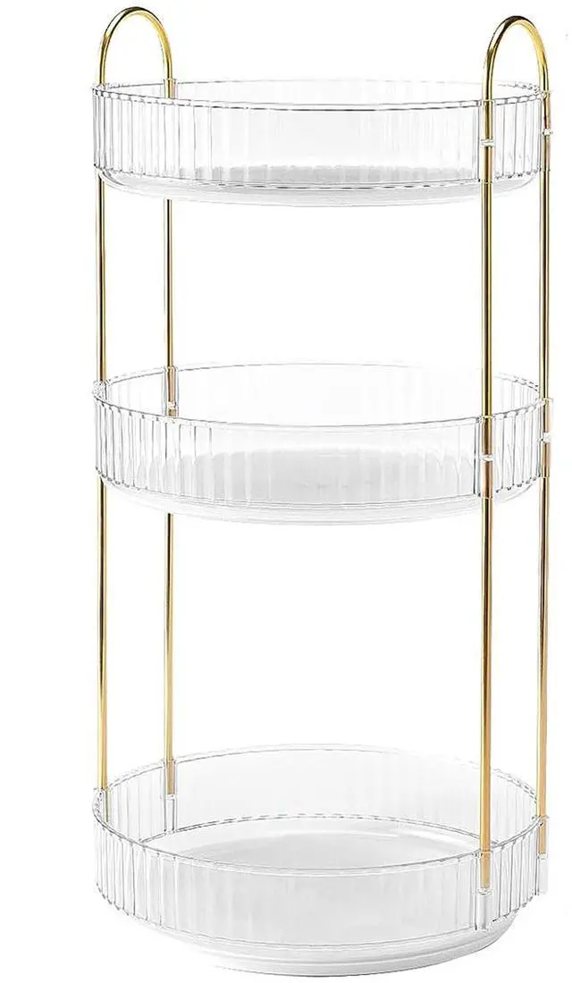 55LBS Max Load: 3 Trays make full use of vertical space and save 80% of desktop space, 9.05 in in diameter of tray renders you well organized space to place perfume, lipstick, nail polish, powder blusher, eye shadow, base makeup, makeup powder, makeup brush, skincare, and etc.. 1.96 in Rim of each tray prevents your cosmetic product from falling off fron the tray.