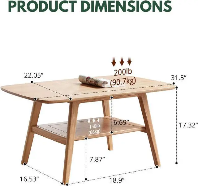 Wood Coffee Table - 100% Solid Oak Wood - Double Storage Coffee Table, Eco-Friendly Finish Center Table - Easy Assembly (Natural, 31.49" D x 19.68" W x 17.32" H)