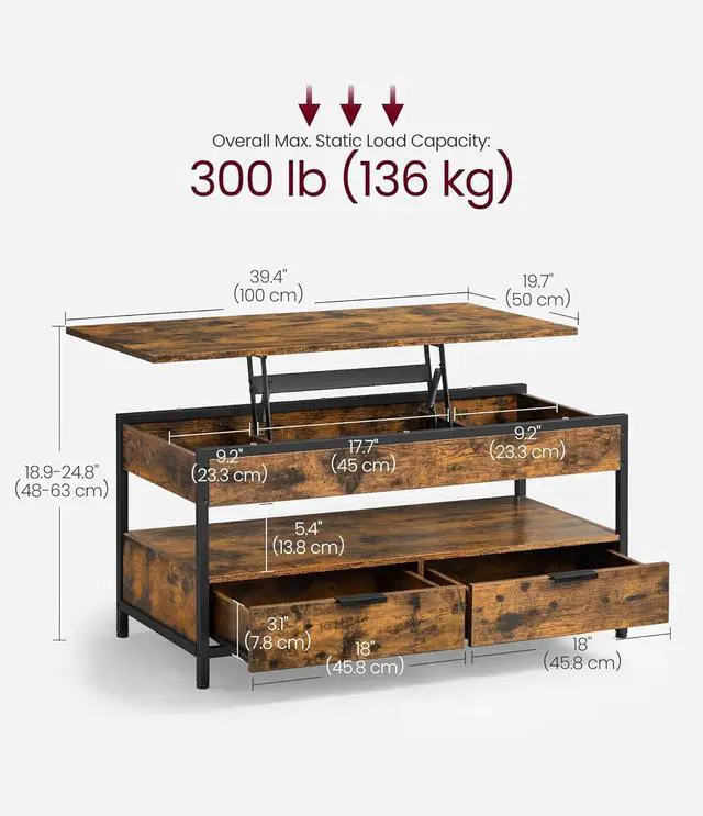 [Lift-Top Design for Added Comfort] You can raise the tabletop of this coffee table to a comfortable height from 18.9 " to 24.8 ", making it easier for you to work from home, enjoy meals, or play games while sitting on your couch