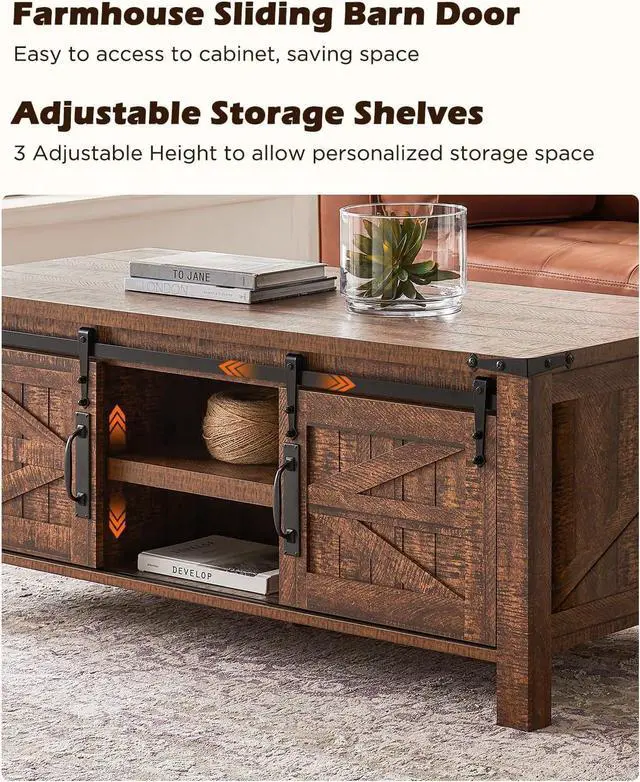 Elevate your Living Room: This farmhouse coffee table with storage bundles functionality and farm aesthetics into one. Features classic barn door and unique farmhouse wood grain finish, adding a touch of rustic charm and cozy natural vibes to your space. The corner metal trim adds more exquisite. Not only keeps the living room neat and tidy but complements the surrounding furniture and decor, feels inviting and welcoming, gathers the family around, and enjoy the warmth and intimate ambiance