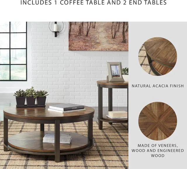 TABLE SET: Fill your living room with cool, farmhouse inspired style. The rich, handsome finish on these tables is complemented by butterfly pattern veneer and a dark bronze-tone wood frame