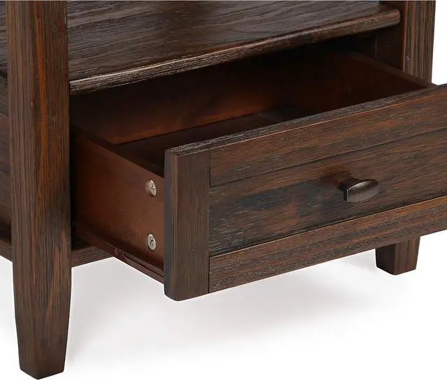 Features one bottom drawer with metal drawer glides and large open shelf for storage