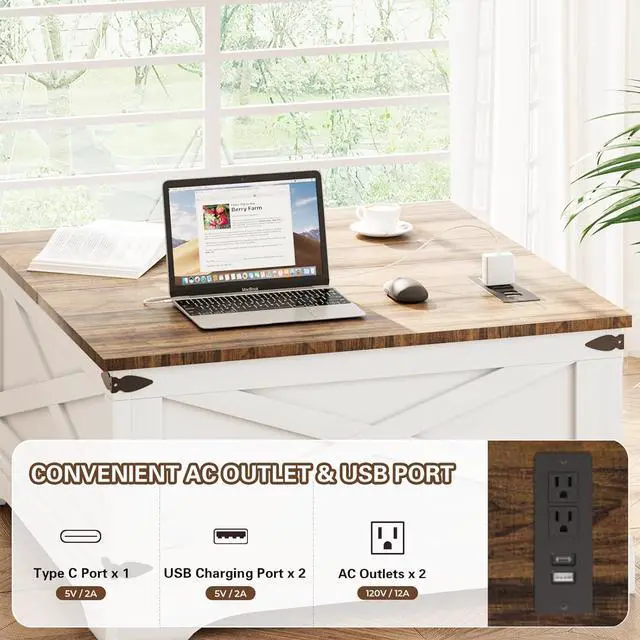 Convenient Charging PortsThis coffee table comes equipped with 2 AC outlet, 1 USB charging port, 1 Type C charging port making it easy to keep your devices charged and within arm' s reach.