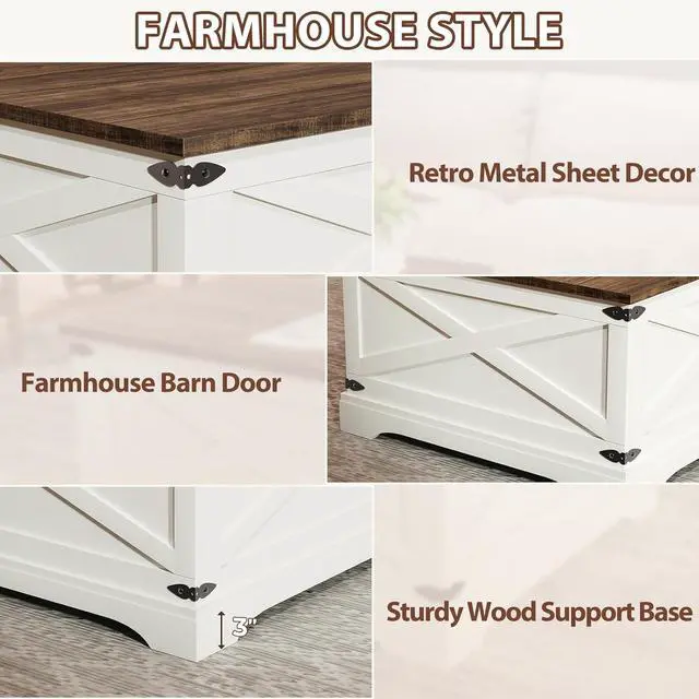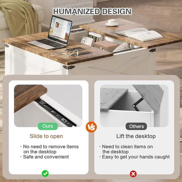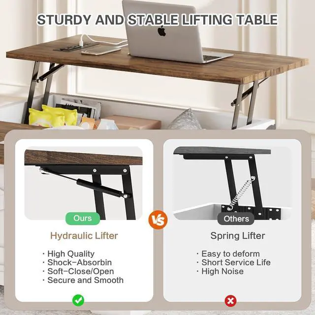 Lift Top DesignThe square coffee table top is divided into two, and one side is equipped with a stable lifting mechanism that can effortlessly lift the top 5 inches, turning it into a computer desk for comfortable work. The other side is equipped with smooth slide rails, allowing you to access the items inside the coffee table without having to clean the tabletop.