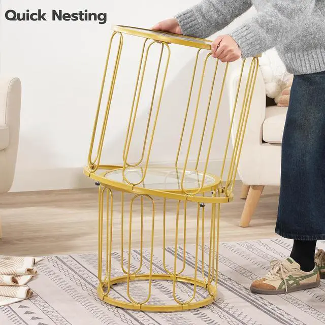 Flexible Use: The gold side tables have spacious round tops for versatile use. They provide ample space for coffees, snacks, and other items within reach. They can also be nested to save space and facilitate cleaning, combining appearance with convenience