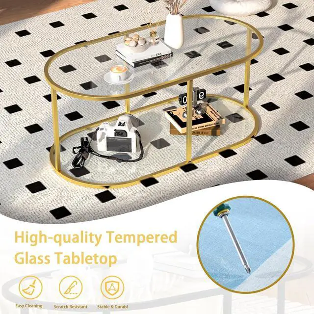 UNIQUE & ELEGANTThe oval coffee table with modern design, clear solid glass top with gold metal frame, adding a touch of beauty to your living room or office.