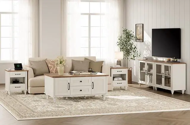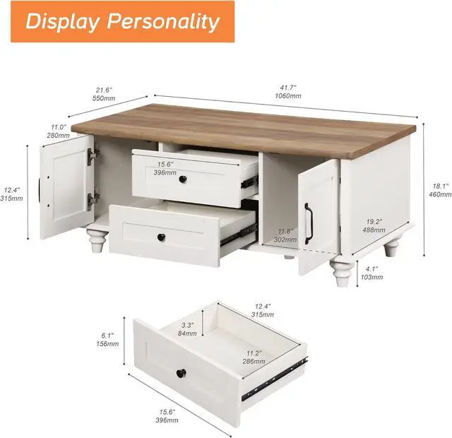 Practical Large Storage SpaceThis white coffee table features 2 drawers which can be slid in and out smoothly, easy to store your magazines, remote controllers and more while keeping them away from dust and maintaining a clean and tidy living room. And the storage cabinets on both side offer more storage space.