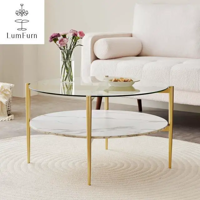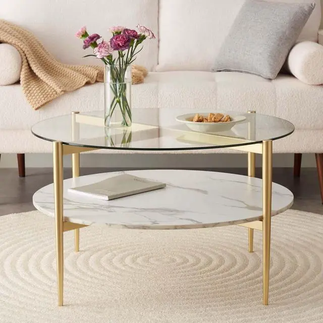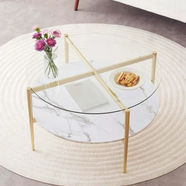 Elevate your Living RoomWith this stunning modern elegance coffee table. Featuring a spacious round top, measuring 30 inches in diameter, it offers ample surface area for displaying your favorite decorations, serving drinks, or keeping daily essentials within reach. Its dual-tier structure not only maximizes storage but also adds visual interest to your living area.