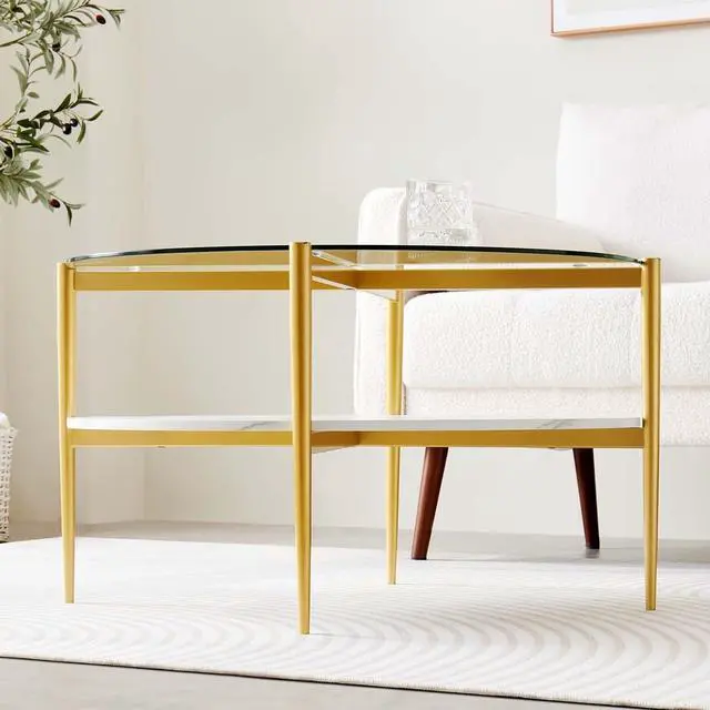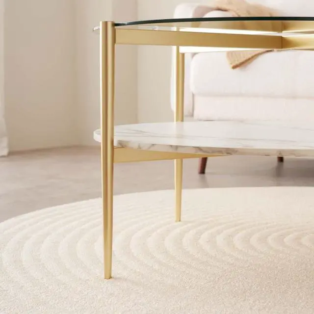 Mid-Century Modern DesignThis mid-century modern coffee table boasts a circular silhouette, featuring conical legs and smooth, elegant lines. Its clear glass top and white marbling MDF top offer a stylish contrast, while the solid construction ensures durability. The beautiful design adds a sense of harmony and balance to the space, embodying the owner' s refined taste and appreciation for timeless elegance.