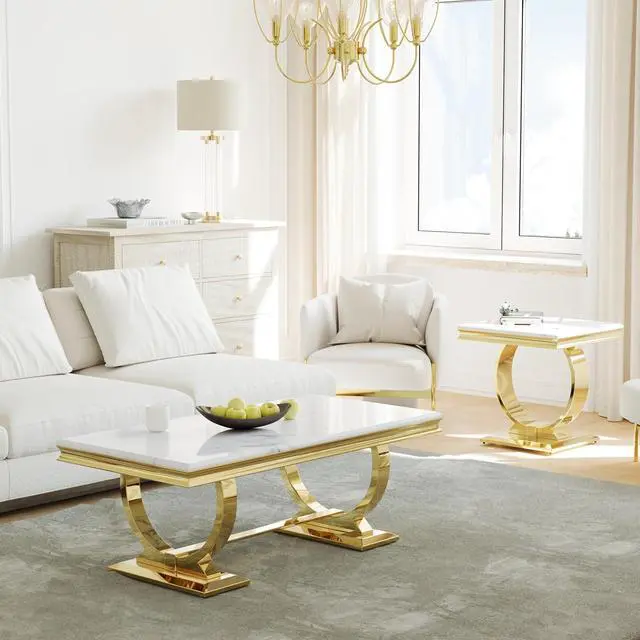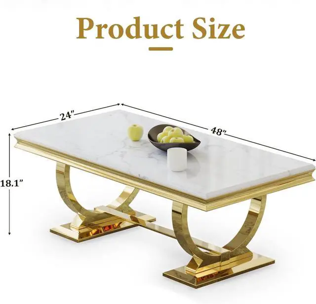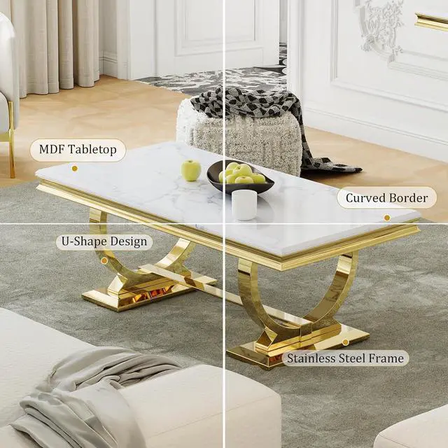 Gold Coffee Table: White exquisite texture tabletop plus unique double U-shaped base, this coffee table is modern and elegant, exquisite craftsmanship with simple shape, it is the most dazzling existence in the living room, creating a warm and comfortable living room atmosphere.
