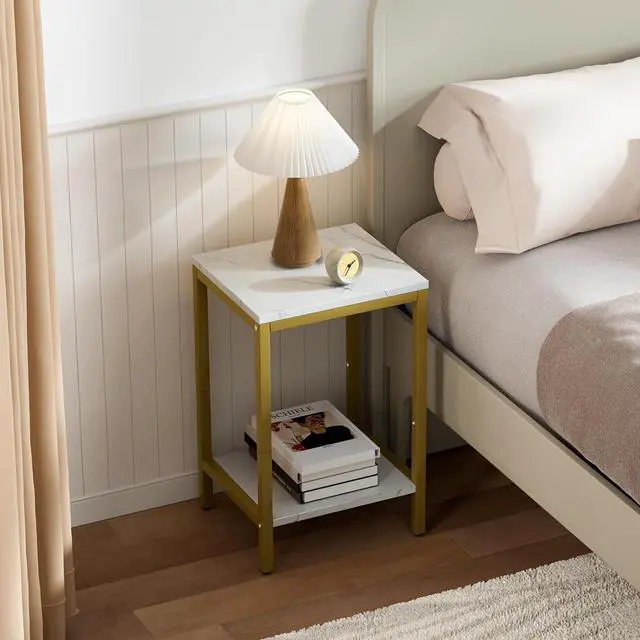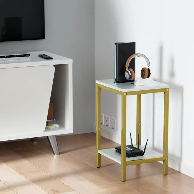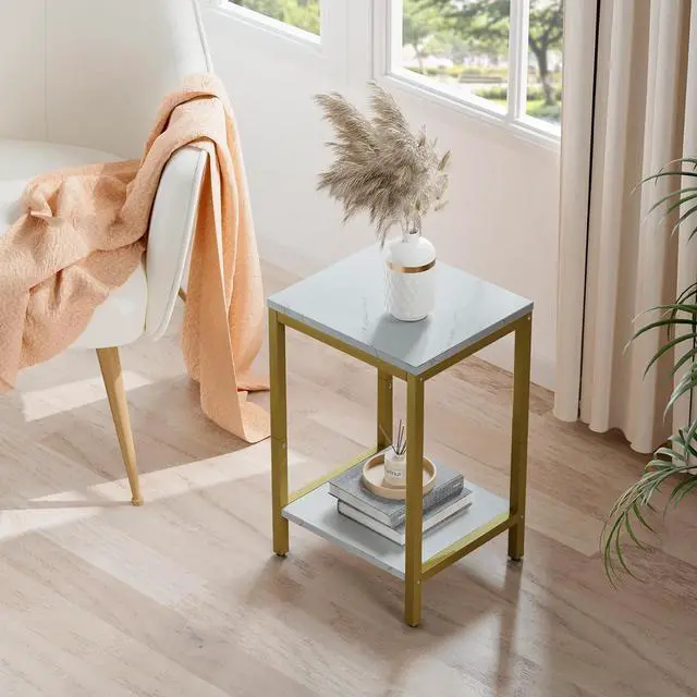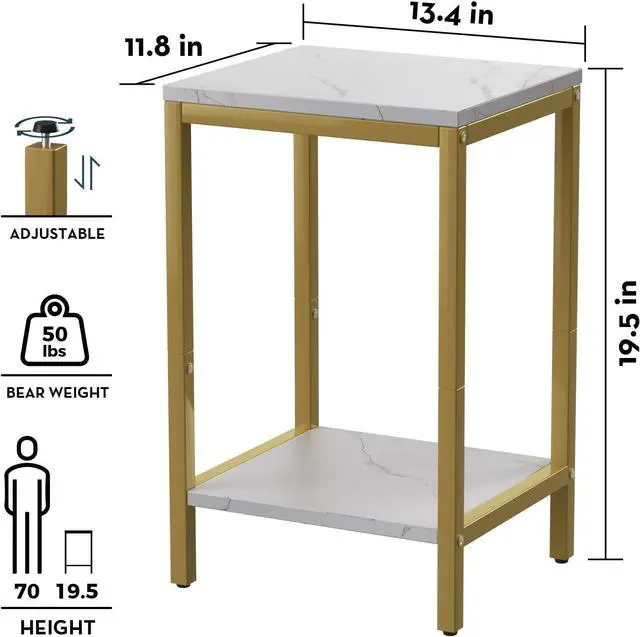 Storage and Adjustable2 Tier design-industrial marble like top and gold metal shelves make great use of small spaces and tight quarters. Adjustable feet made it easy to level on a slightly in level floor and more stable. Useful and beautiful addition to your living bed area.