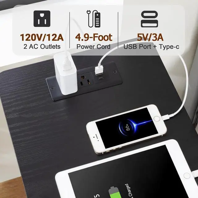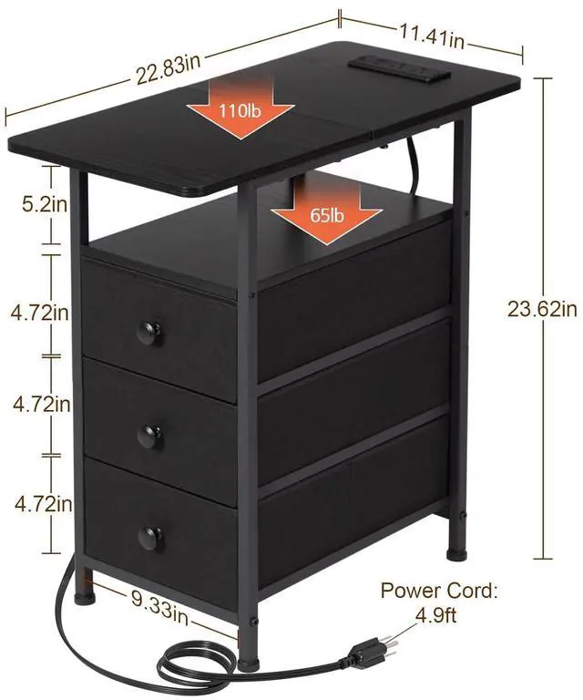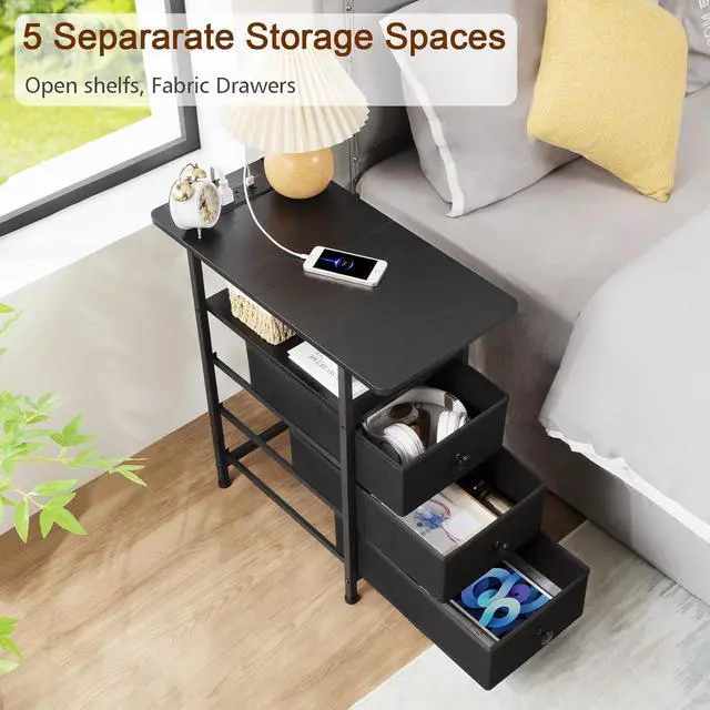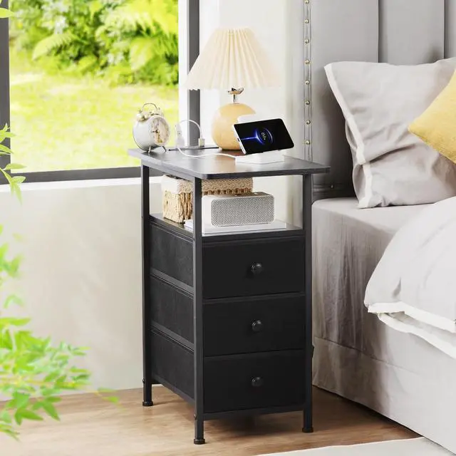 Narrow Nightstand with Charging Station: Tired of limited plugs? This slim nightstand features 2 AC outlets and a USB-C port, offering a convenient charging solution for your electronic devices