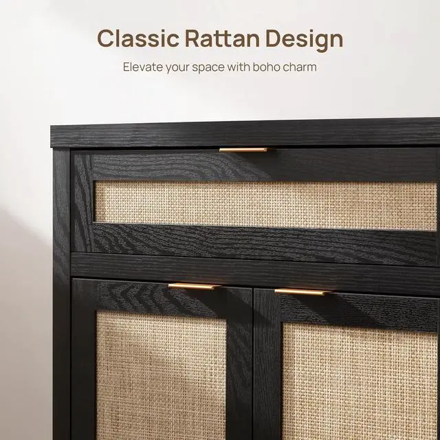 Classic SideboardOur storage cabinet blends modern and classic styles with its wooden cupboards, rattan doors, and gold handles, making it a perfect addition to any room in your home.