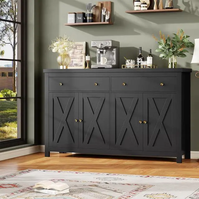 Modern Style--Black tabletop with wooden grain and distressed vintage metal handle of this black buffet cabinet, adds a great farmhouse flair to your home. Together with black barn doors, this console table with storage blends modern stylish elements with a distressed vintage look, to create a charming storage solution that matches most home decor.