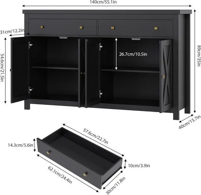 Ample Storage for Various Needs--Tired of messy utensils in the kitchen or dining room? Dont miss out on this buffet cabinet with storage. The spacious tabletop can place coffee makers or microwave ovens. 2 large drawers allow you to classify your tableware, tissues, etc. Inside this show-stopping black buffet are 2 adjustable shelves, allowing you to stash away items in different sizes.