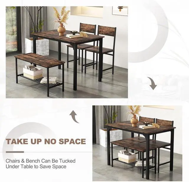 Space-Saving Design Improves Utilization: Two armless chairs and the bench can be tucked under the table without taking up space. Also, the extra rack under the bench, meeting the needs of sitting & storing. All in all, this table set is suitable for limited living space.