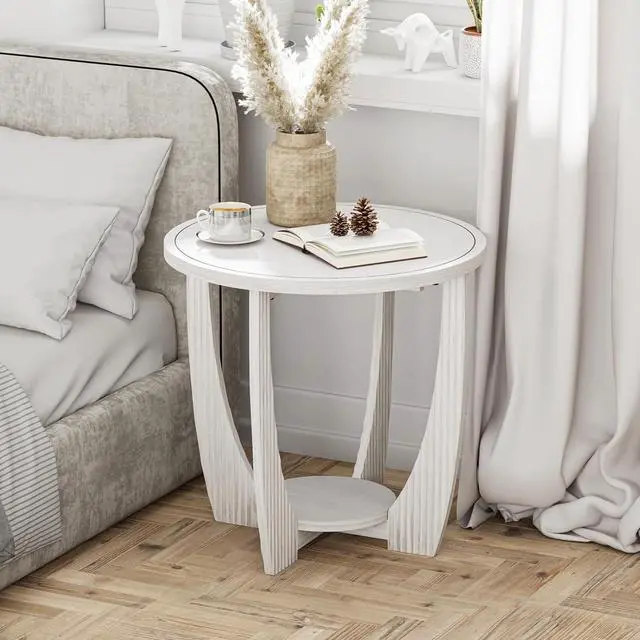 Elegant Farmhouse Design: This end table exudes rustic charm with a contemporary twist, featuring a white distressed finish that complements the farmhouse aesthetic. The vertical striped design on the solid legs adds a textural element that is both visually appealing and sophisticated.