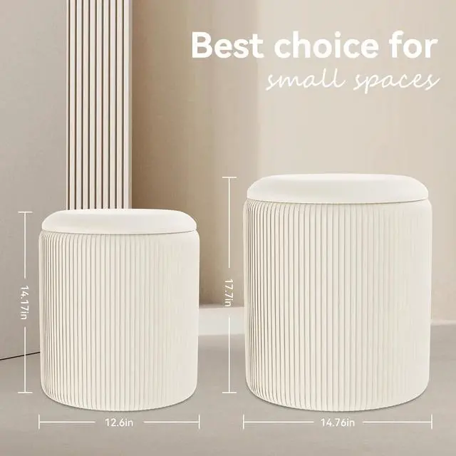 Multifunctional DesignThis small round velvet ottoman with storage is perfect for various scenarios. Use it as an ottoman, a vanity stool, or a footrest. The upholstered lid can be flipped and used as a coffee table, adding versatility to your living space.