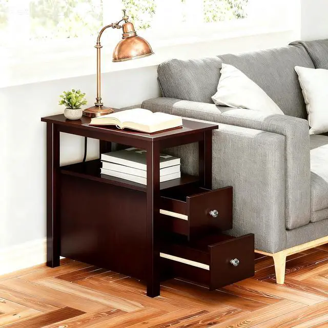 Esppesso End Table: The small side table features black finish, vantage handles, rural style. storage drawers with smooth wood side rails, all reflected the end tables elegant and simple natural design. The waterproof and smooth table surface is easy to clean