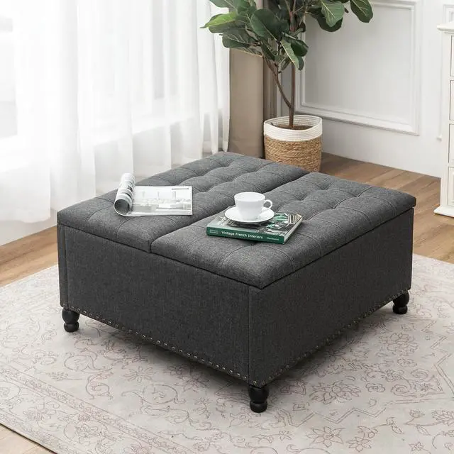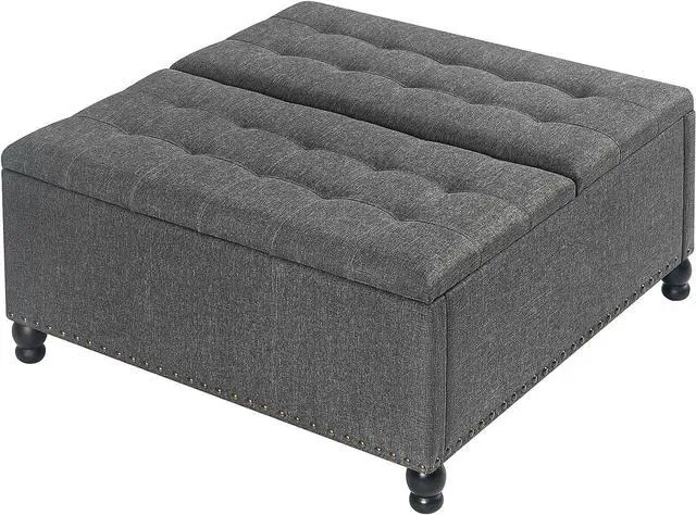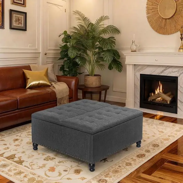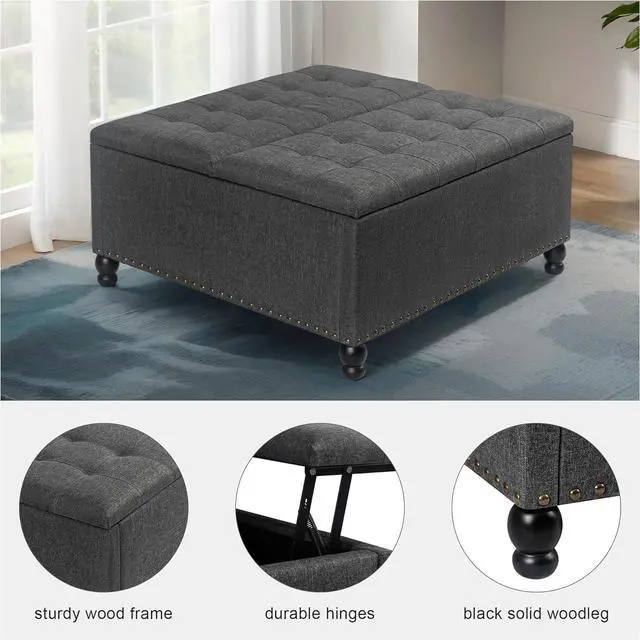 SIZE & MATERIAL: 33.7 " L x 33.7 " W x 17.7 " H, The Storage Ottoman is made of solid wood frame with tufted, stable and sturdy, and the tufted seat adding traditional elegance to the piece. Rivet design of retro style brings dignified and elegant noble atmosphere to your home decoration.