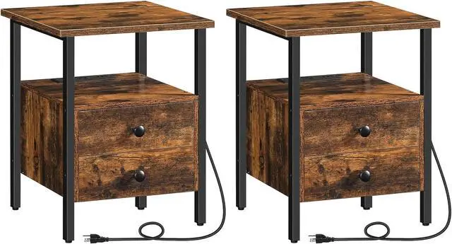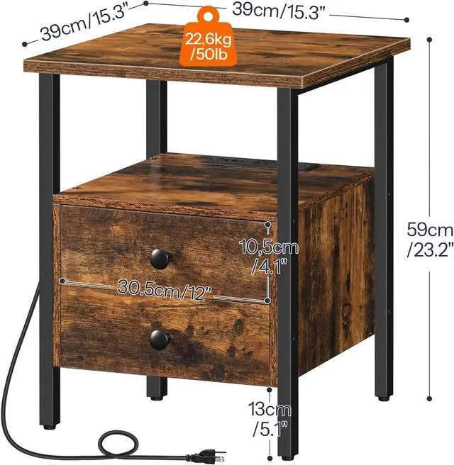 Charging Function: The size of the bedside table is 15.3 " L x 15.3 " W x 23.2 " H. And the charging station with 4.9 ft long power cord includes two 3-prong outlets and 2 USB ports which can easily charge your phone, tablet, desk lamp or laptop. The power outlet is right by your side, everything you need is at your fingertips