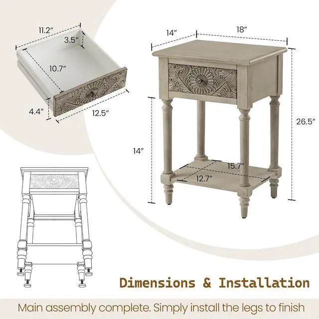No Assembly RequiredWe will install the wood end table with a drawer before delivery. After receiving the goods, you only need to install the table legs to use it. It is convenient and quick. Our installation will be more professional and make the product more durable.