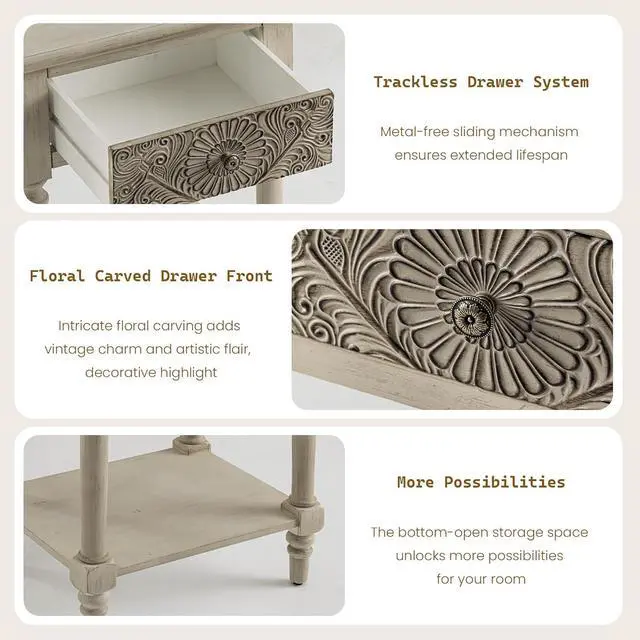 Exquisite HandcraftedUsing engineered wood and pine as materials, matched with antique style and handmade carved design. Hand-carved patterns make the fully assembled nightstand more prominent.
