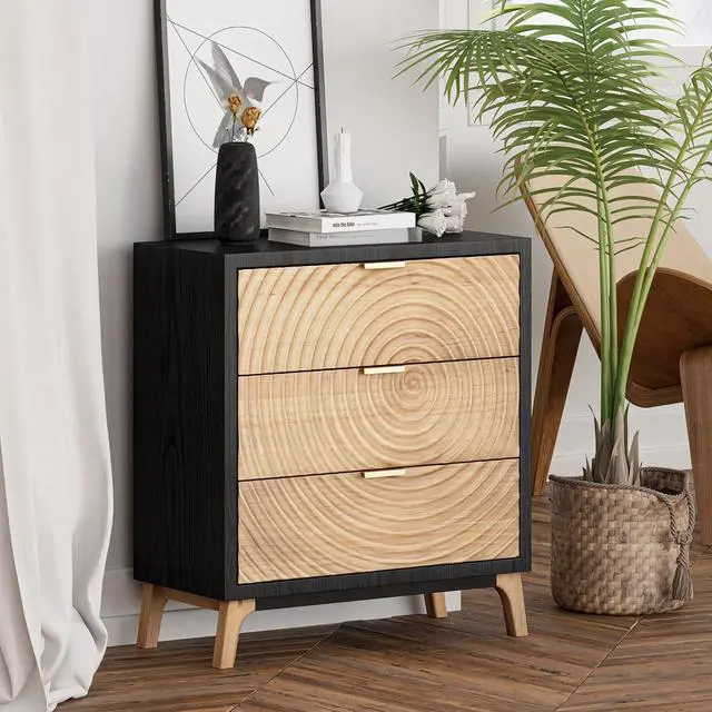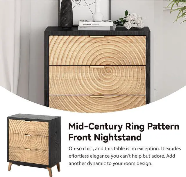 Farmhouse 3-Drawer NightstandMid-century chic goes contemporary-coastal in this beautiful accent chest. The retro-like wood ring pattern is designed on the front of the drawer, Black-wash wood frame encases three spacious drawers
