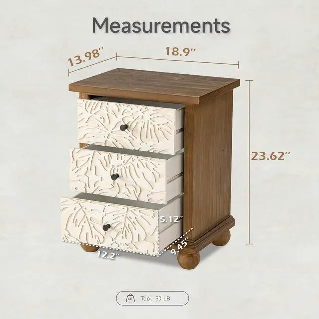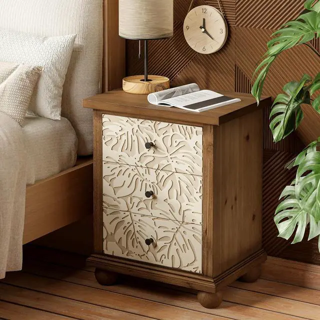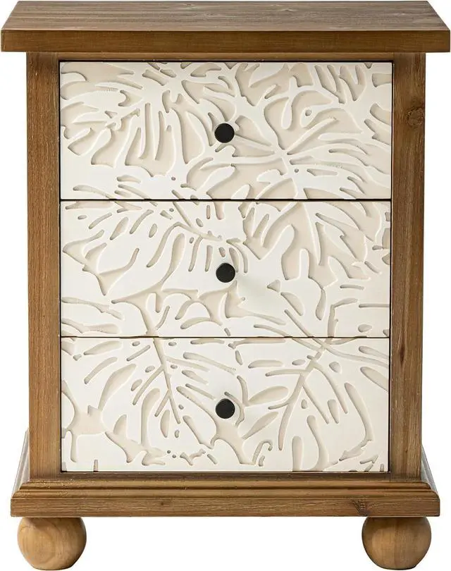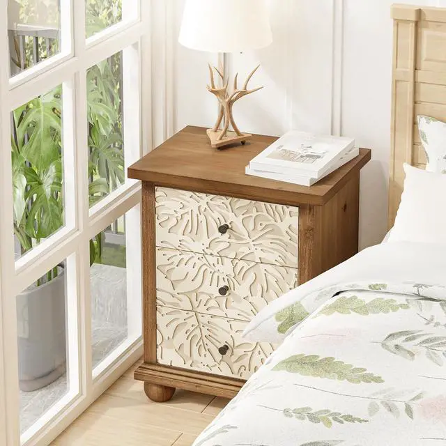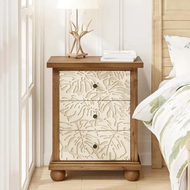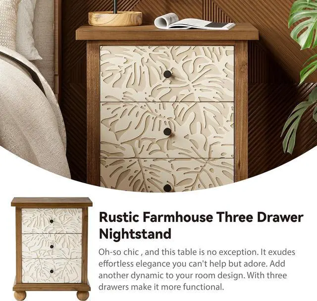 Designer StyleExquisitely carved lifelike leaf patterns, paired with a premium tactile hand-finished surface and adorned with natural wood grain accents, the classic combination of creamy white and vintage brown makes this farmhouse nightstand the perfect piece of furniture for your home.