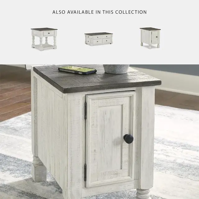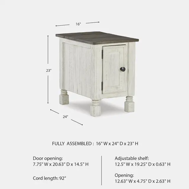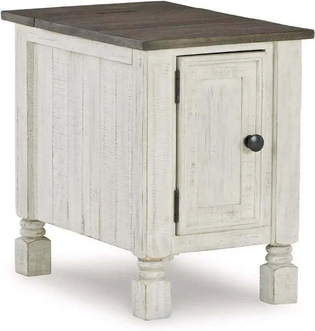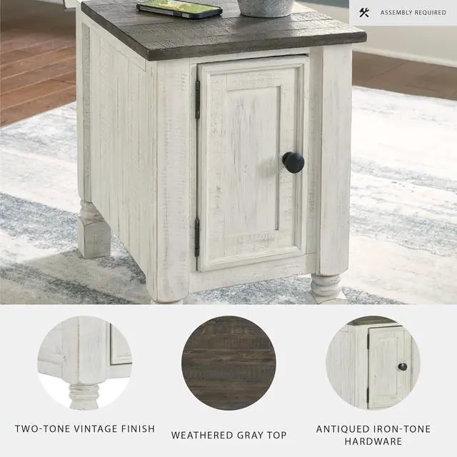 RUSTIC CHARACTER: This side table' s design features thick crown moulding, beautified with a vintage two-tone finish. A small flip lid located on the top conceals a power outlet and USB ports