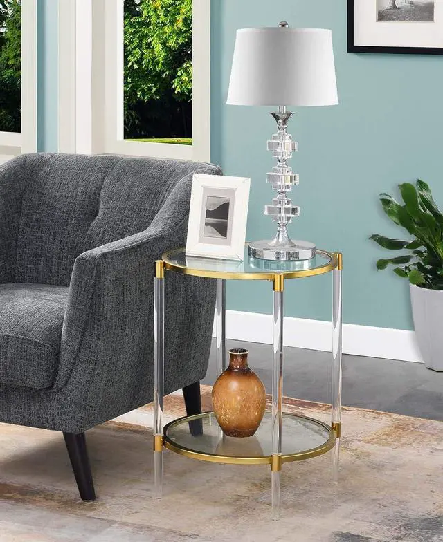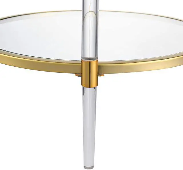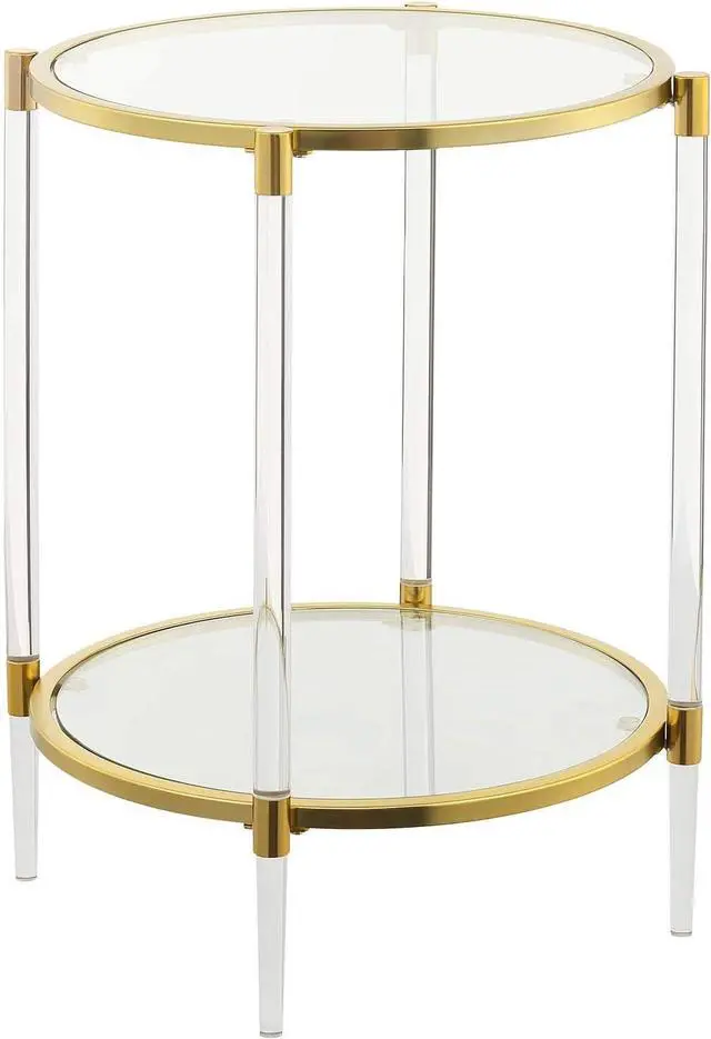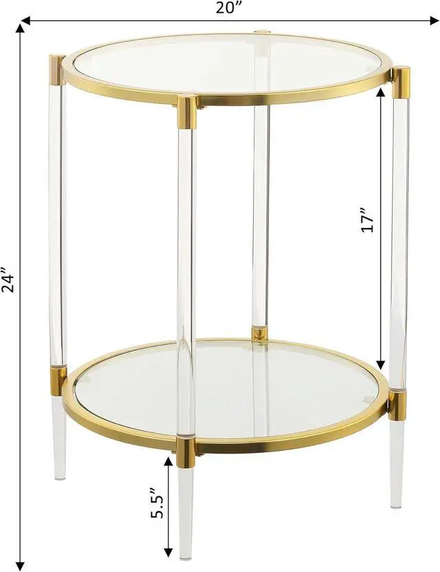 Part of the Royal Crest Collection Contemporary Style 2 Tiers of Clear Tempered Glass Supported by Acrylic Legs & Gold Chrome Frames (L) 20 in. x (W) 20 in. x (H) 24 in. Color May Vary Slightly Due to Photography Lighting or Monitors Display