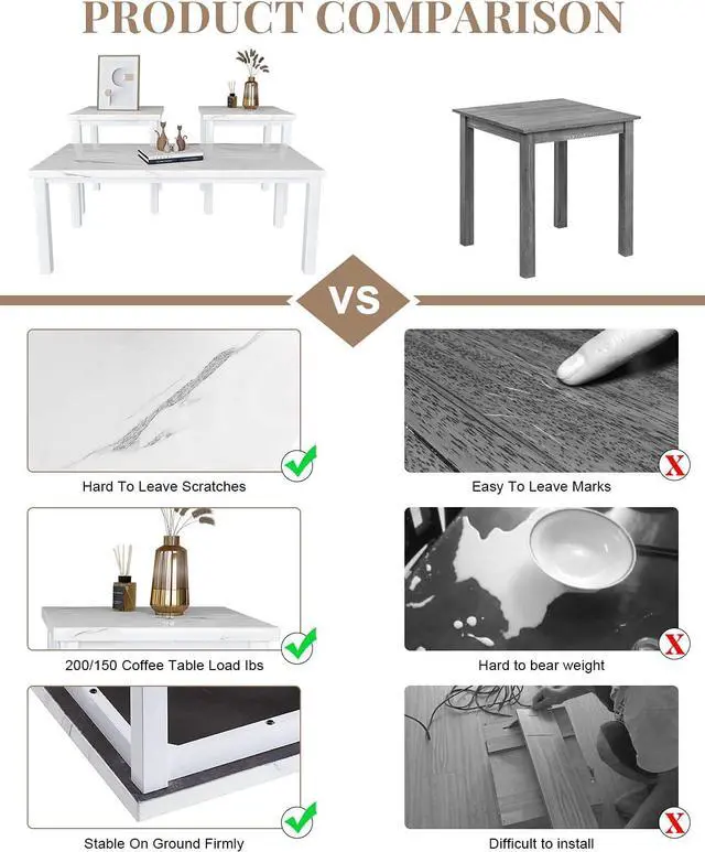 NEAT STRUCTURE: Coffee Table Set The sturdy black iron frame table base and the top smooth artificial polyurethane marble table top are made of, the frame is fully coated, rust-proof and durable, giving a delicate feeling. smooth and stable, long service life, can withstand 200 pounds of weight. coffee tables for living room