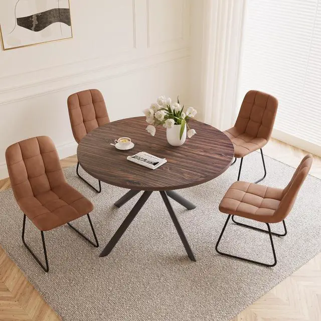 Functional Dining Set: This set includes a round table and 4 leather chairs, designed for easy conversation and gathering with family and friends.