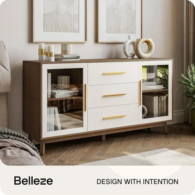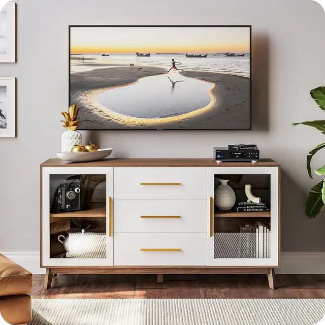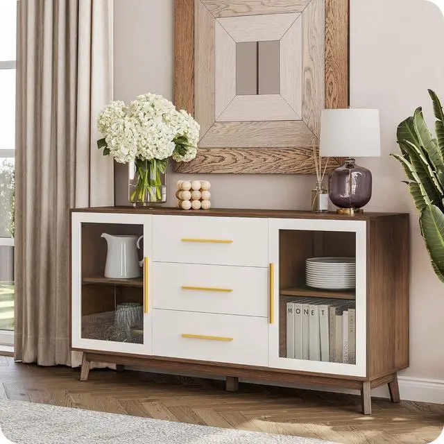 STYLISH SIDEBOARD: Blends white accents with a warm wood grain finish and gleaming gold-toned metal handles for an elegant look. Tapered legs give this wood buffet sideboard a trendy mid-century modern touch.