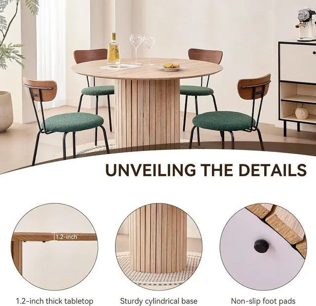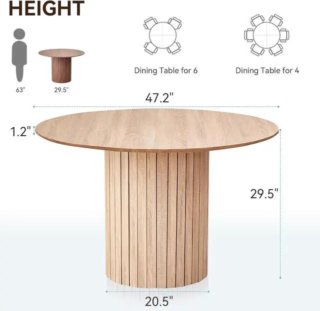 PERSON: A tabletop diameter of 47 inches, a height of 29.5 inches, and a base diameter of 20.5 inches, making it ideal for family meals or small gatherings. It comfortably seats 4 to 6 people without taking up too much space while providing ample dining area. Made from engineered wood with a wood veneer.