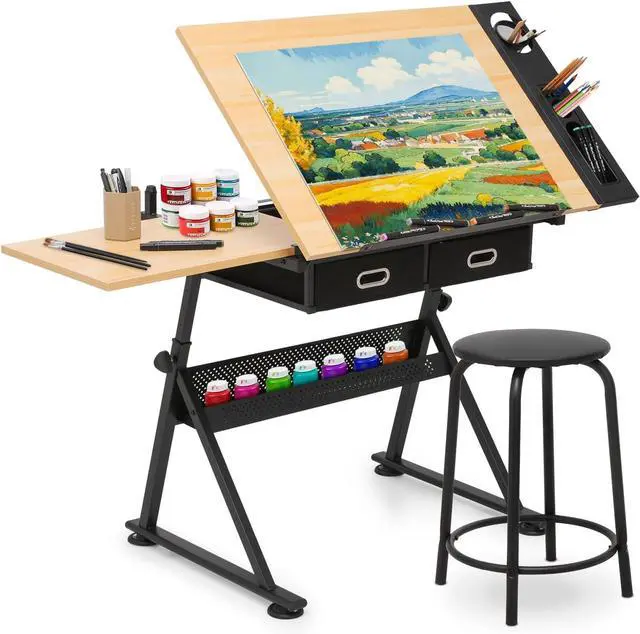 Multipurpose Drafting Table Set: This art table and stool set can not only be used as a drawing table, computer table and writing desk for daily life, but also widely used in various outdoor creations, art painting or work occasions.