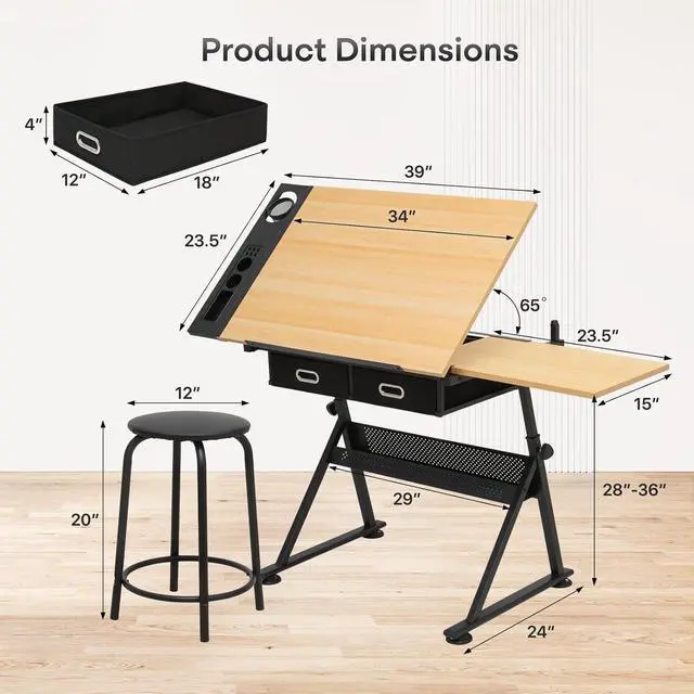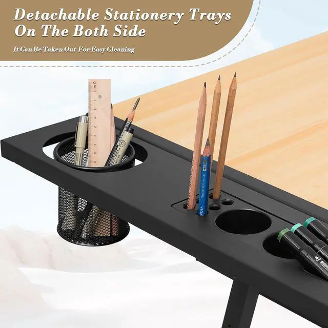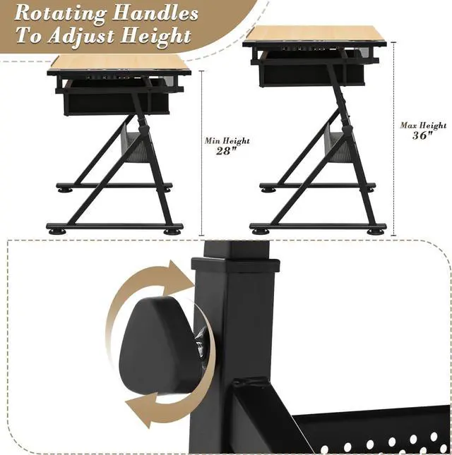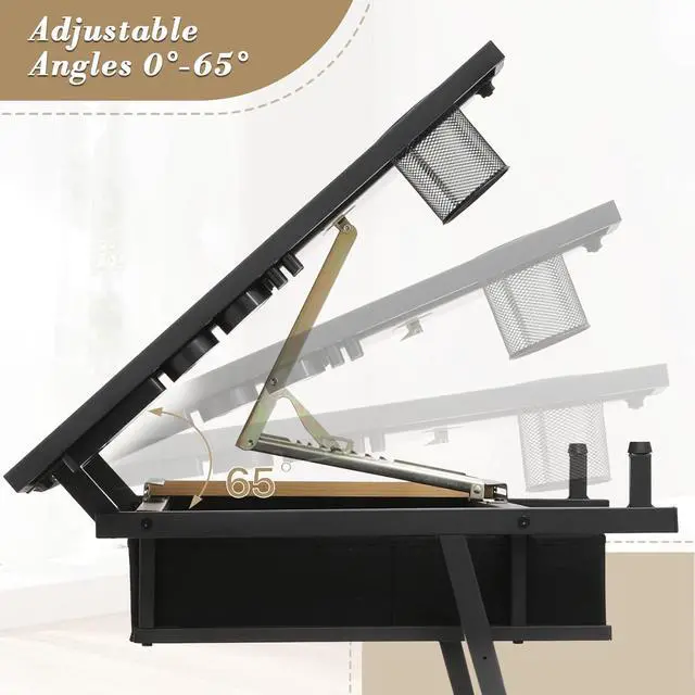 Height-Adjustable Drafting Table: There is a height-adjustable knob on the support rods on both sides of the table, and the pencil ledge on the stationery tray is also adjustable, both of which can be adjusted according to personal needs.