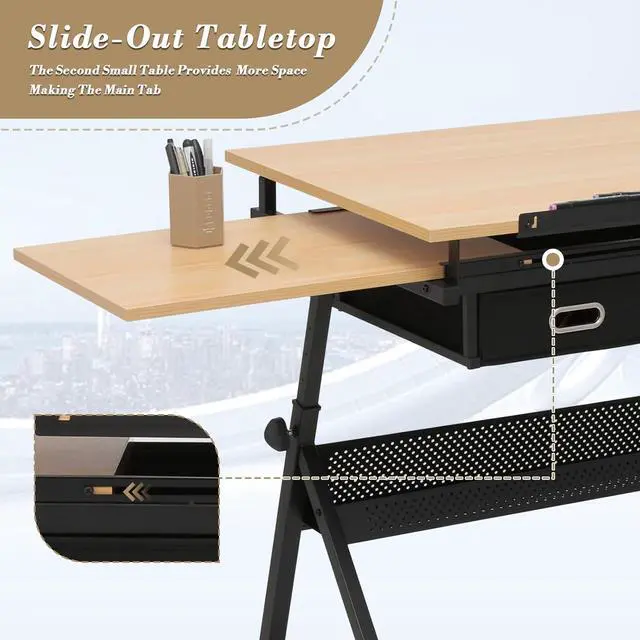 Durable Support: Drawing desk adopts a triangular metal frame design, enhancing the sense of design and stability. Both tabletops are made of engineered wood. Waterproof and rust-proof, long service life.