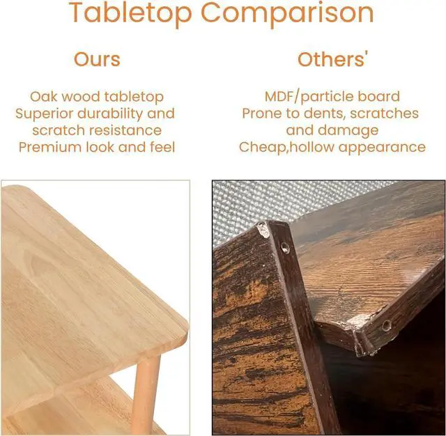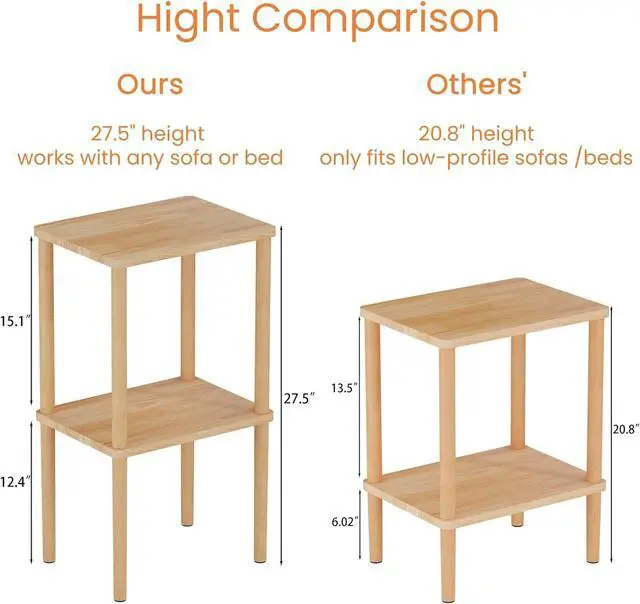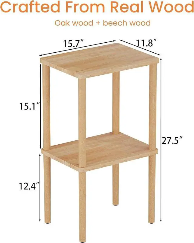 100% Solid WoodNo cheap MDF or particle board! Our side table crafted from genuine natural wood (oak wood + beech wood). The surface coated with clear varnish, no smell non-toxic while preserving the natural wood texture. The anti-slip foot pads offer greater stability and avoid scratching the floor. The load-bearing capacity of this end table is up to 120lbs. it securely holds heavy lamps, stacks of books, or even a printer.