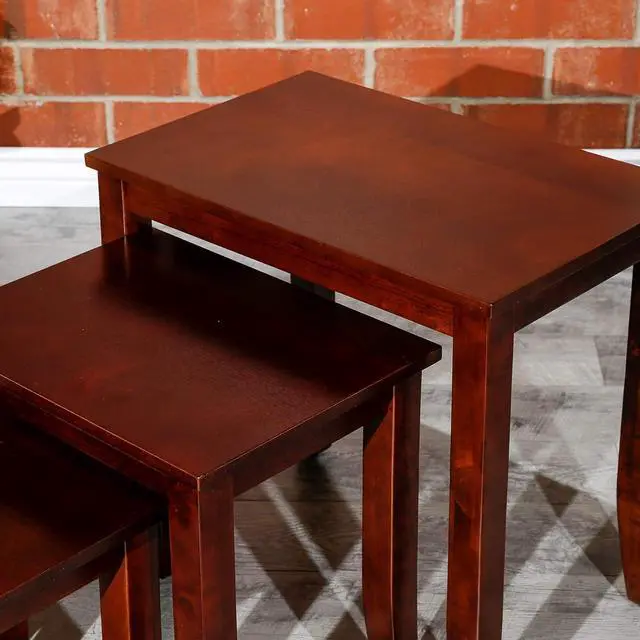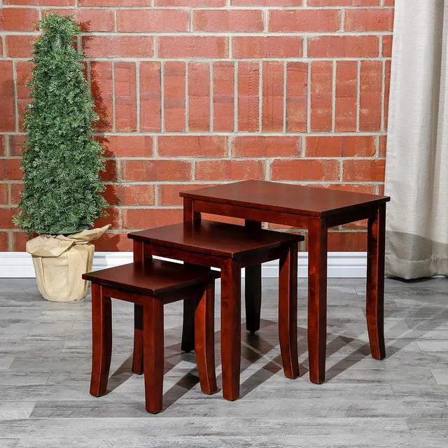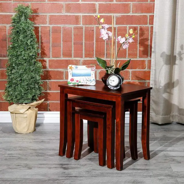 -: Crafted with solid wood and finished in cherry, this wooden table set fits effortlessly into compact layouts. Perfect for use as nesting side table, stackable tables, nesting side tables, or nesting coffee table set of 3, they store easily without occupying excess space.