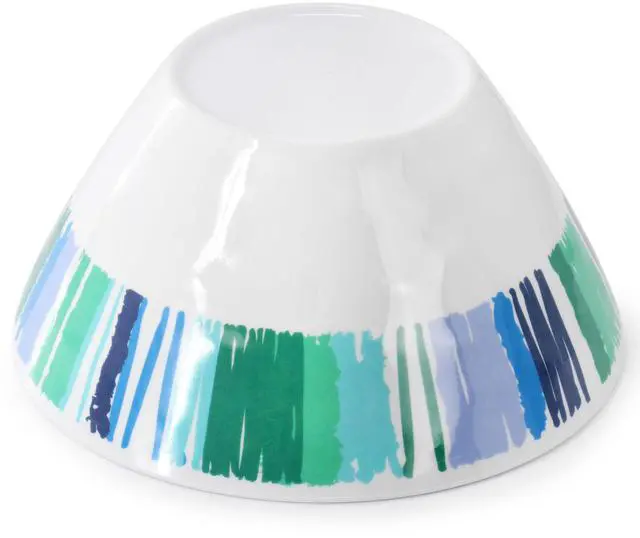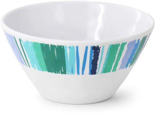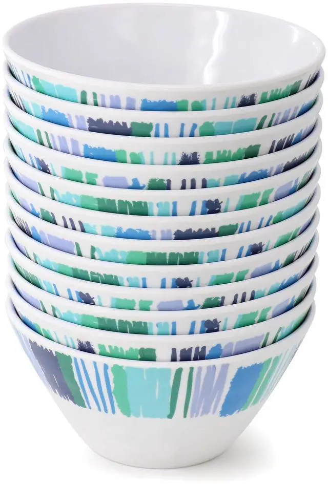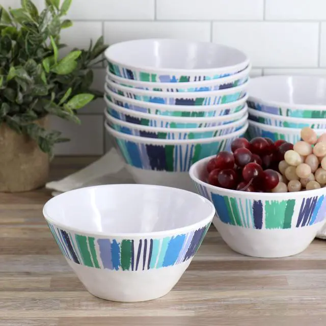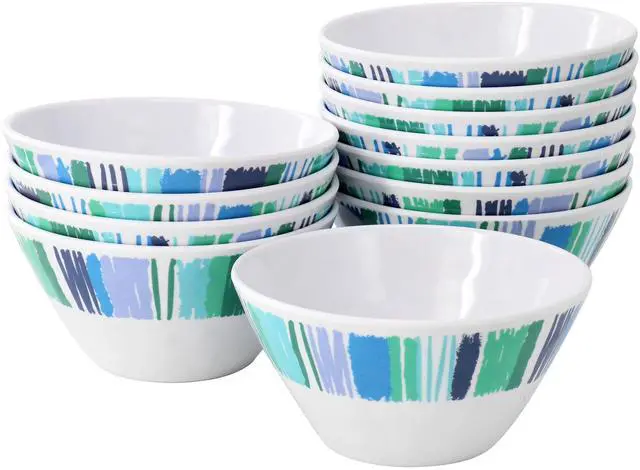 Liven up your dishware with this 12 piece plastic bowl set by Gibson Home. This bowl set is constructed with lightweight durable melamine that is top rack dishwasher safe for easy clean up. Each bowl features a multi colored stripe design and a hammered texture that will give a colorful accent to your favorite meals. The vibrant colors and fun design is perfect for outdoor gatherings, dining with kids, and every day use alike. Stack-able shape makes it easy to save space while storing. Add some pattern and color to your cabinets with this tropical set!