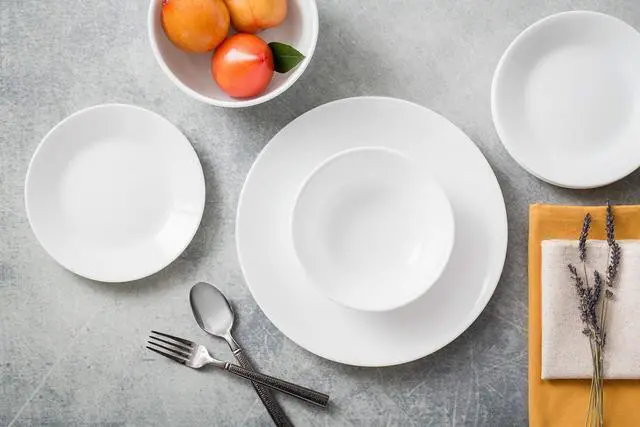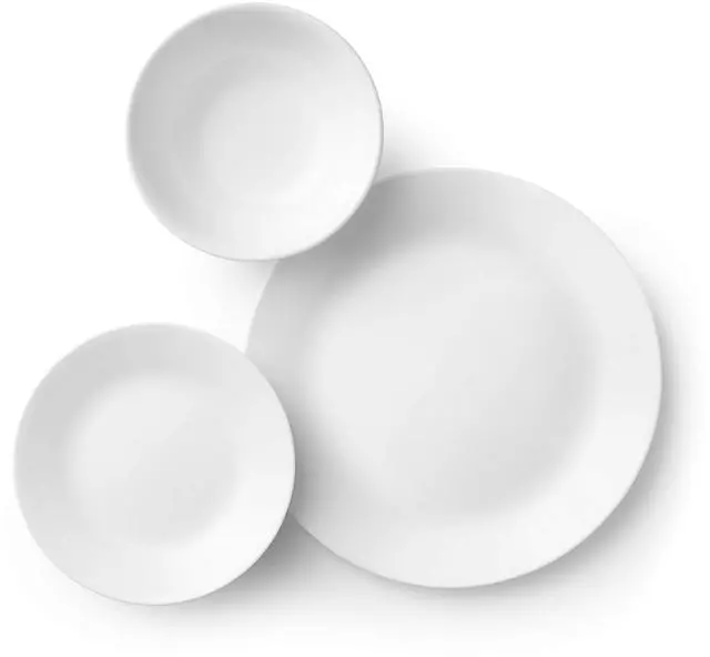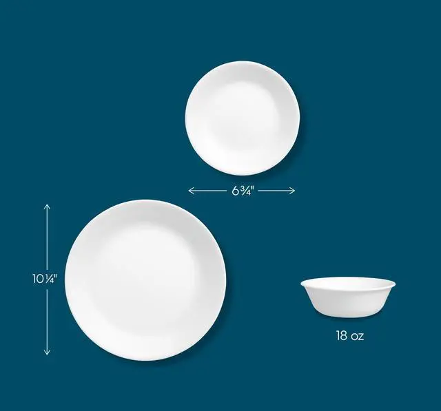 Functional and versatile, this living ware dinnerware set brings timeless and classic styling to your dining experience. Living ware winter Frost set includes 18 pieces total, including six (6) sets of each: 10-1/4-inch dinner plates, 6-3/4-inch bread and butter plates, and two-ounce soup/cereal bowls. This set features simple and elegant all-white pieces, perfect for complementing your existing dinnerware. All pieces are made of triple-layer strong Glass, which is break and chip resistant, lightweight, and easily stackable for space saving. Dishwasher safe, This non-porous and versatile dinnerware can be used in the microwave and oven.