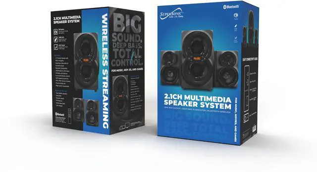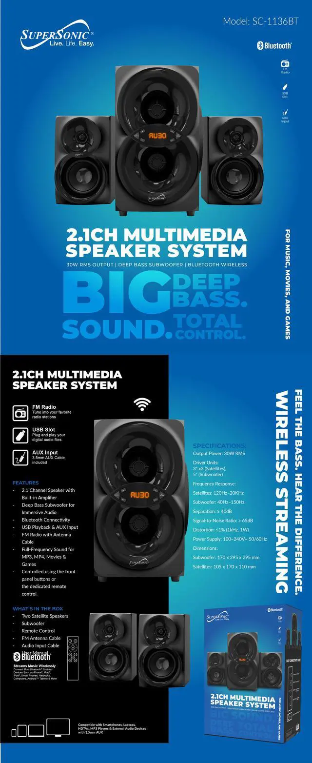 Upgrade your home audio experience with the Supersonic SC-1136BT 2.1 Channel Multimedia Speaker System.