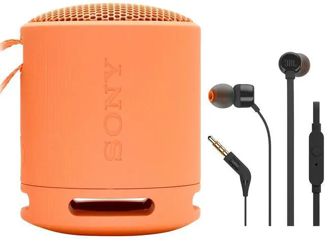 SONY XB100 PORTABLE WATERPROOF BLUETOOTH SPEAKER (ORANGE) + JBL T110 IN EAR HEADPHONES Sony XB100 Portable Bluetooth Speaker (Orange) Ready to deliver your favorite music at the beach or by the pool, the black XB100 Portable Bluetooth Speaker from Sony features a protective UV coating and IP67-rated resistance against both water and dust. Even with its ultra-compact size and only a 1.8" full-range driver and passive radiator, the XB100 can create a large soundstage thanks to Sony's Sound Diffusion Processor. Stream music to the XB100 from any Bluetooth-compatible device, and when using a smartphone, you can also take advantage of the built-in, echo-cancelling mic for clear, hands-free calls. There's even a color-matching buckle strap for conveniently securing it to a backpack or deck chair.