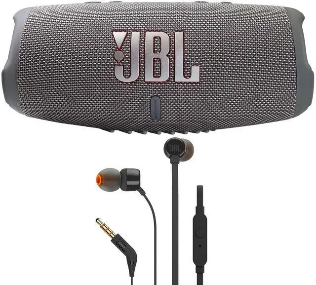 JBL CHARGE 5 PORTABLE BLUETOOTH SPEAKER GRAY + JBL T110 IN EAR HEADPHONES JBL Charge 5 Portable Bluetooth Speaker (Gray)Bring the party nearly anywhere you go with the gray JBL Charge 5 Portable Bluetooth Speaker. With a built-in rechargeable battery that lasts up to 20 hours and an IP67 waterproof and dustproof rating, you can bring the speaker to the beach, park, pool, or wherever you like, and stream music, podcasts, and more wirelessly via Bluetooth. It outputs up to 40W of total RMS power, and dual passive radiators help boost the bass.