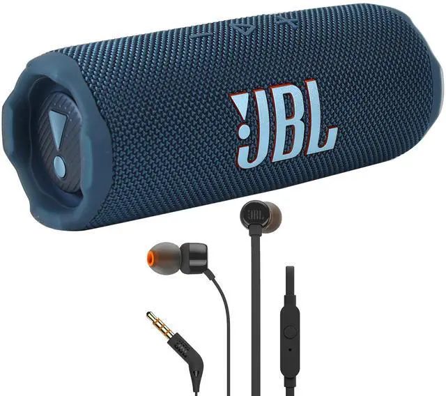 This Bundle from Teds Electronics includes:- JBL Flip 7 Portable Waterproof Bluetooth Speaker (Blue) + JBL T110 in Ear Headphones Black