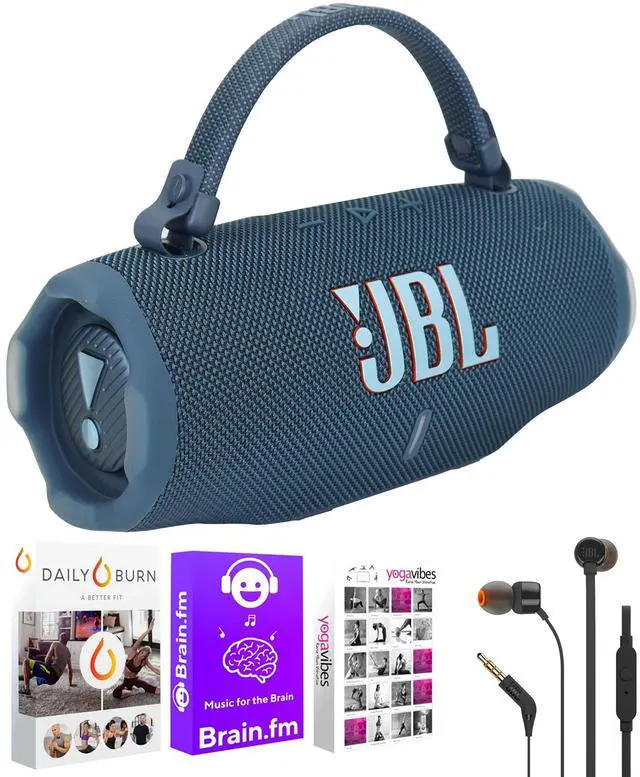 JBL CHARGE 6 PORTABLE WATERPROOF BLUETOOTH SPEAKER (Blue) + JBL T110 IN EAR HEADPHONES BLACK + 92783 FITNESS AND WELLNESS PLUS SOFTWARE SUITEJBL Charge 6 Portable Bluetooth Speaker (Blue)For effortless mobile sound that can easily be carried with you, get a hold of this Charge 6 Portable Bluetooth Speaker from JBL. With a water- and dustproof design, you can feel comfortable taking the Charge 6 outside near the backyard pool or at the beach. Your streaming music sounds better than ever with up to 45W of audio out that's enhanced by JBL AI Sound Boost. With Auracast support, you can easily share your favorite playlists with other compatible speakers without the hassle of Bluetooth pairing. Whatever you listen to can be enjoyed all day long with up to 24 hours of battery life per charge. It holds so much power that you can recharge your mobile device as you listen, using the Charge 6 as a power bank.